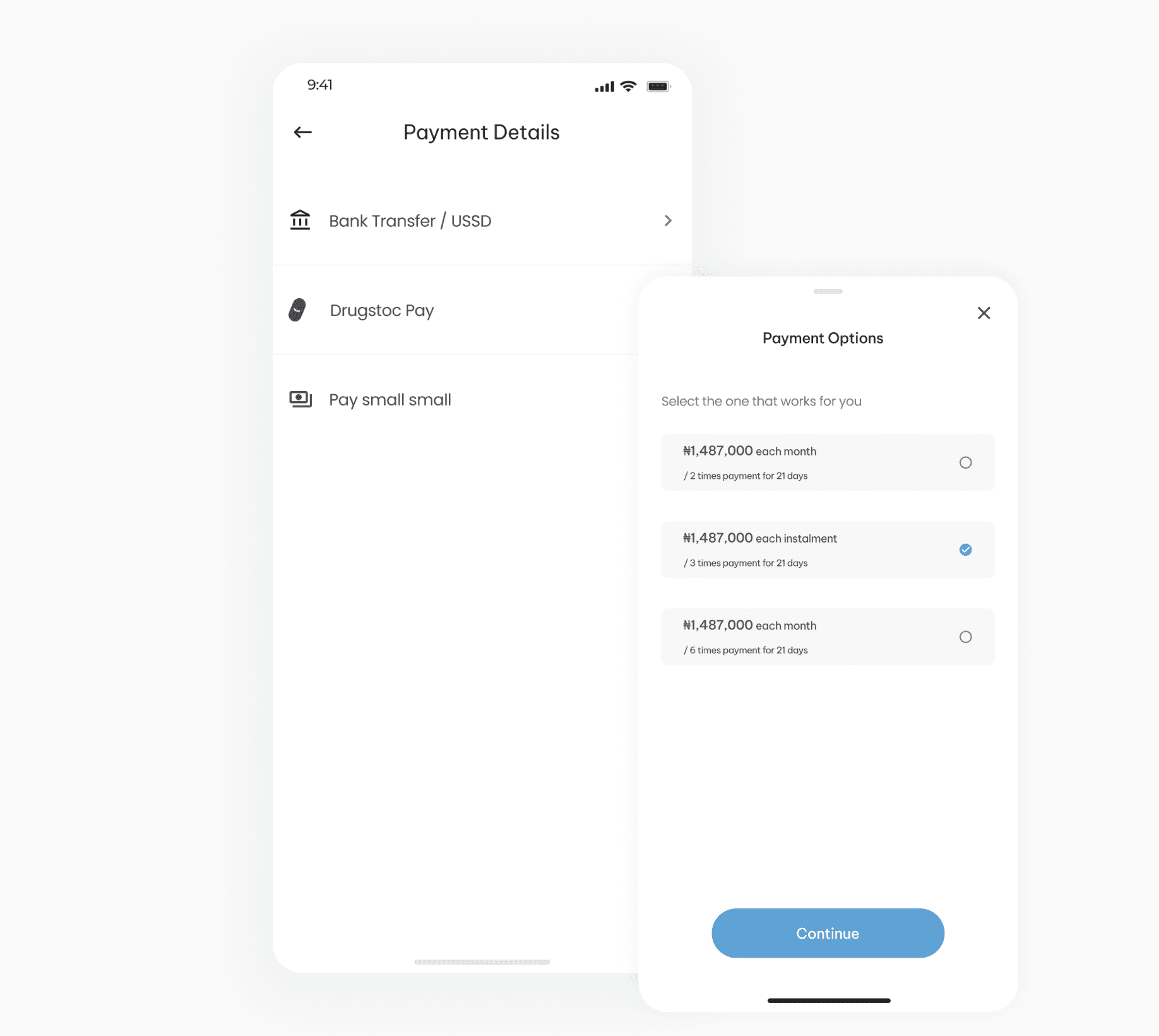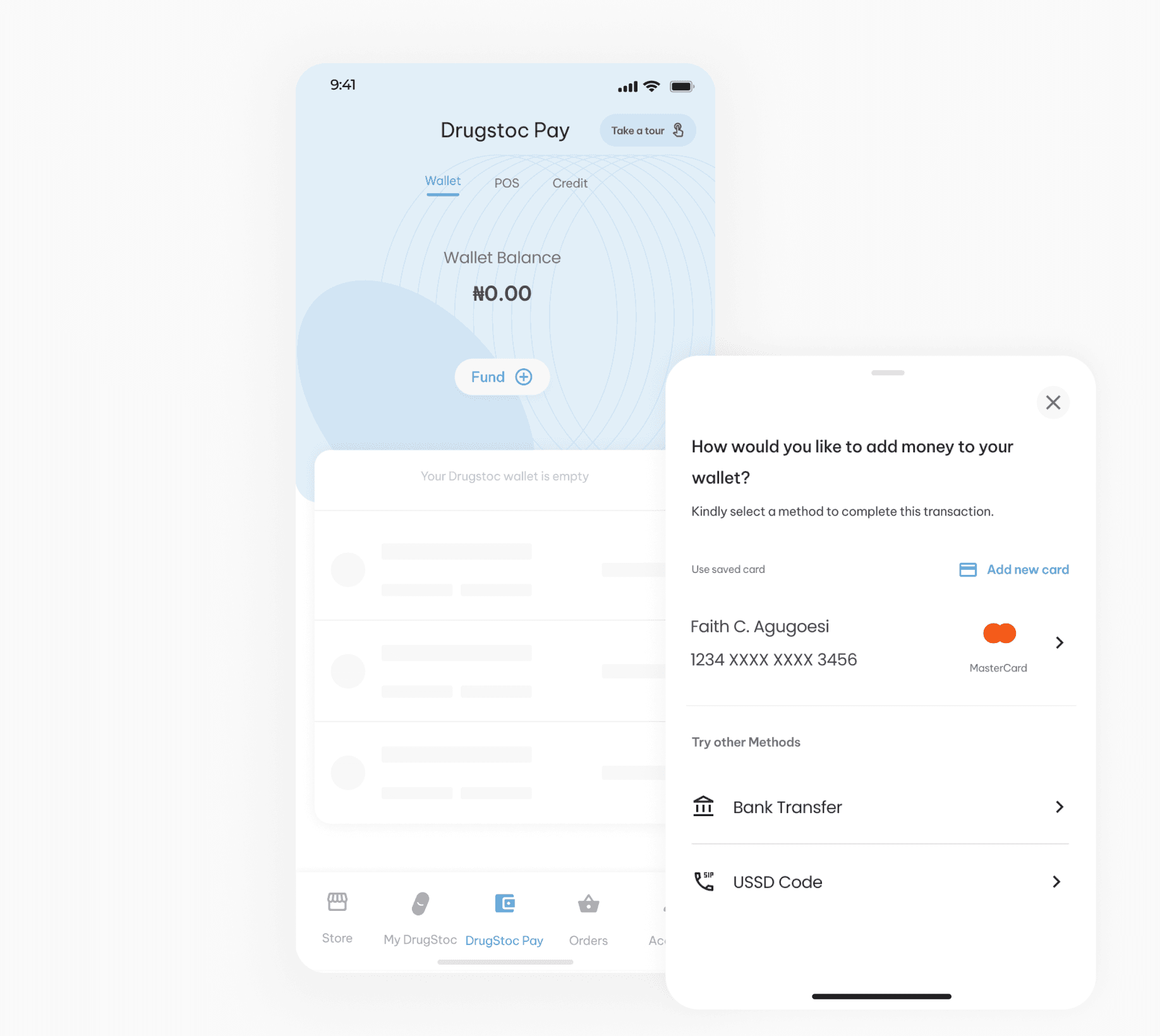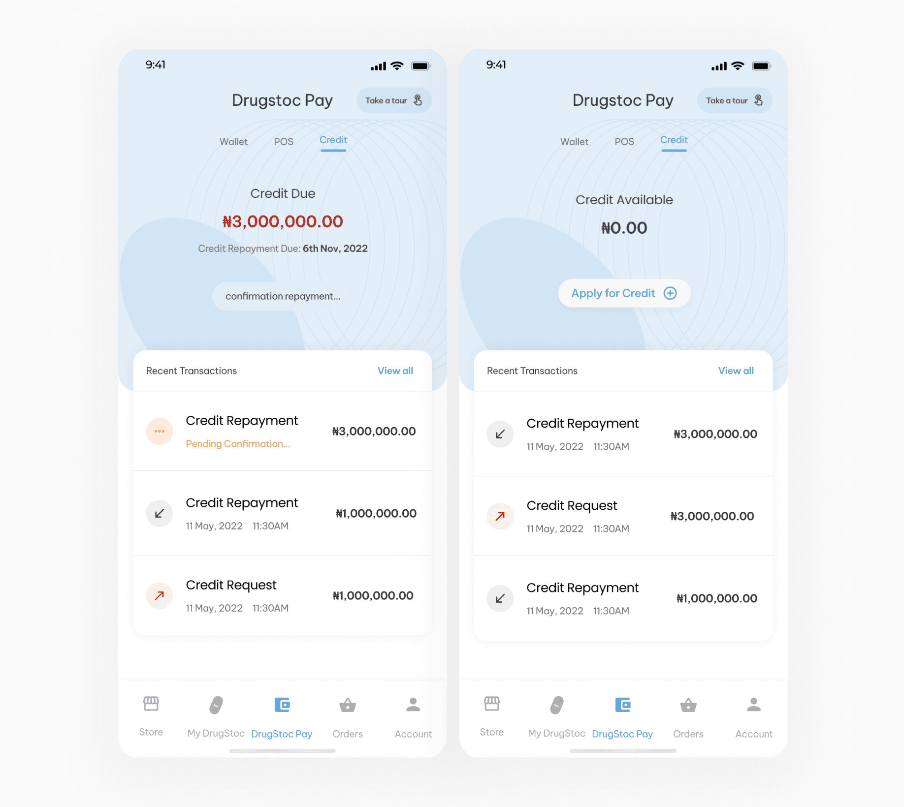 Drugstoc Pay, a wallet system for customers to be able to get credit loans, manage their POS Sales (Receive Payments) and Fund wallet for instant payments and pay bills like light bills for their pharmacies and others.